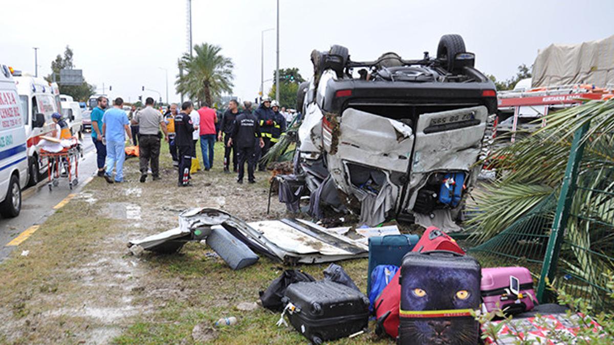 Antalya Havalimanı’ndan aldığı Alman turistleri alan Ömer A.,saat 15.00 sıralarında yönetimindeki 02 DB 595 plakalı minibüsle Manavgat’a bağlı Çolaklı Mahallesi’ndeki kavşağa gelirken yağışın etkisiyle kayganlaşan yolda direksiyon kontrolünü yitirdi.Savrulan minibüs ters dönerek refüjdeki palmiye ağacına çarptıktan sonra durdu. Minibüsün hurdaya döndüğü kazanın bildirilmesi üzerine çok sayıda itfaiye, polis, jandarma ve sağlık ekibi yönlendirildi.