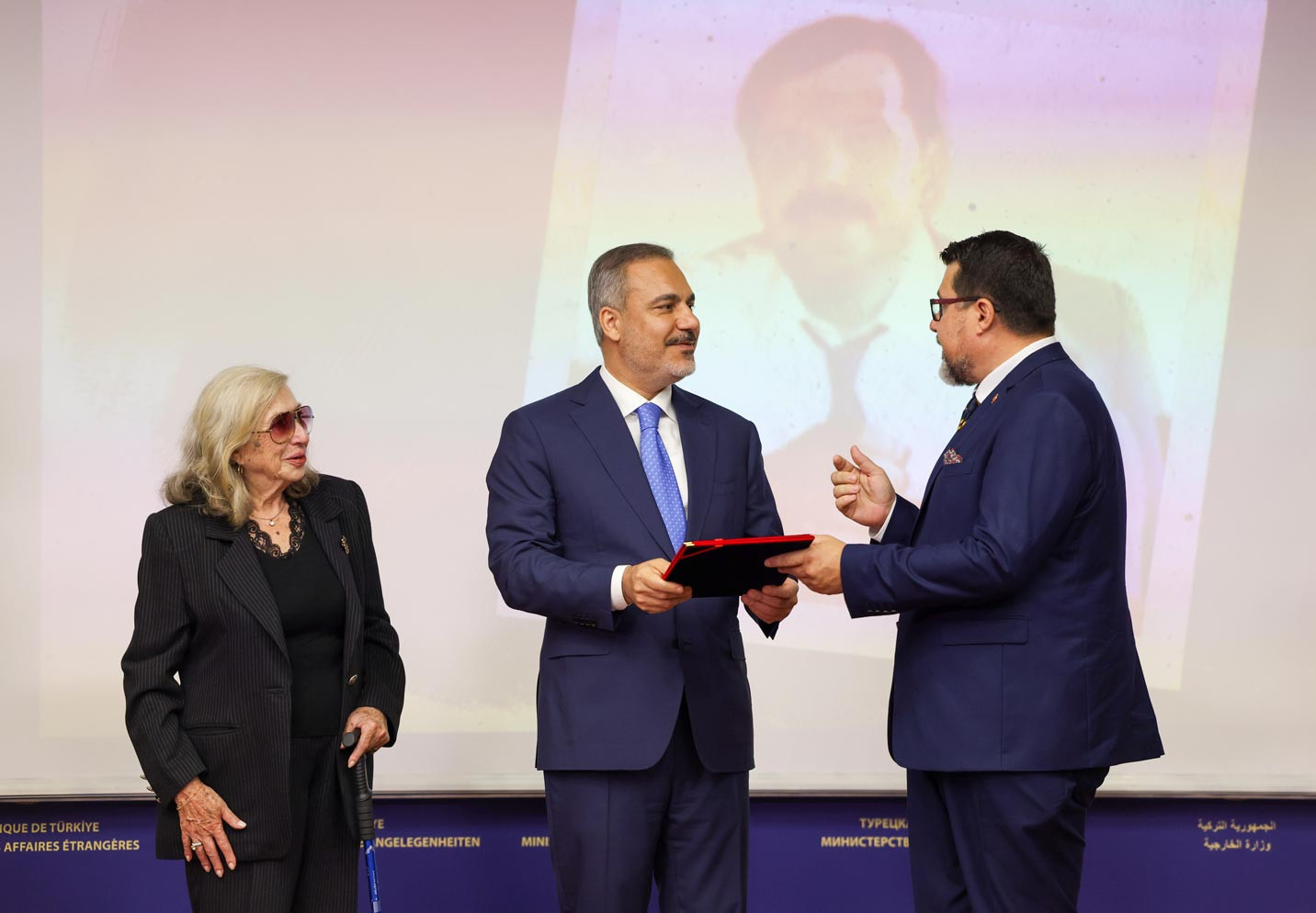 Konuşmaların ardından Bakan Fidan, Büyükelçi Korkut Tufan'a babasının "Dışişleri Bakanlığı Üstün Hizmet Ödülü"nü takdim etti.