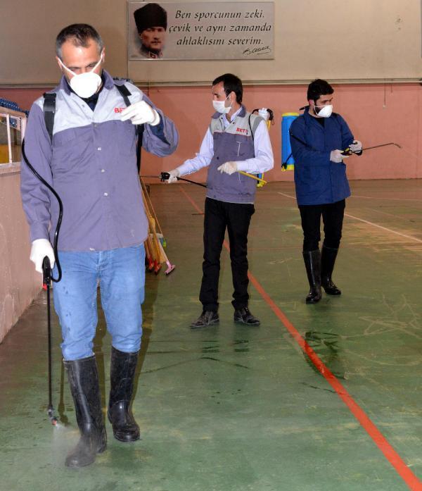 Turgay İPEK/ERZURUM, (DHA)- ERZURUM’da kaçakların barındırıldığı spor salonlarında dezenfekte çalışması yapıldı. Ekiplerin enfeksiyona karşı ilaçladığı salonlardaki malzemeler de temizlendi.