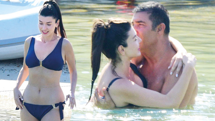 Gün boyu deniz ve güneşin tadını çıkaran oyuncu çiftin serin sulardaki romantik anları objektife böyle yansıdı. (Tolga BOZDUMAN)