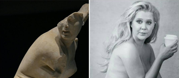 Tam adı Amy Beth Schumer olan ABD'li komedyen Amy Schumer'ın, geçtiğimiz günlerde mitolojik Yunan tanrıçası Afrodit'in heykeli eşliğinde bir pozu paylaşılarak kadın bedenindeki güzellik algısına dikkat çekildi. Paylaşımı yapan 22 yaşındaki Instagram kullanıcısı "whitneyzombie" 1981 doğumlu Schumer için çok konuşulan o paylaşımında şunları yazdı: "Sol tarafta güzelliğin timsali Afrodit, sağ tarafta ise Amy Schumer. İki güzel kadın arasında ne hoş bir benzerlik... Çoğu genç kadın medya ve moda baskısıyla güzellik namına sıfır beden olmadıkları için utanıyorlar. Ama bakın güzelliğin timsalinin bile göbeği kat yapıyor. Güzel olmak için Victoria Secret mankeni gibi olmak zorunda değilsiniz. Vücudunuzu sevin, çirkin değilsiniz."