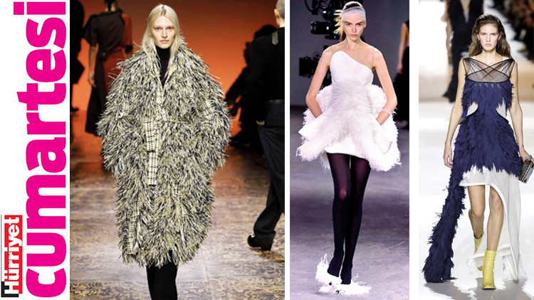 Gelelim tüy detaylarına... Tüyler Louis Vuitton, David Koma, Elie Saab ve Givenchy gibi yüksek moda devlerinin koleksiyonlarında ortaya çıkıyor. Hepsinin ortak özellikleriyse gece görünümlerini süslemesi. Tüy detaylar başlı başına o kadar güçlü ve dramatik bir etki yaratıyor ki belki de gündelik stillere uygulamak pek de kolay değil. Ancak özellikle yılbaşı döneminde ve kış parti ve davetlerinde tüy detaylı parçaları tercih edebilirsiniz. Özellikle elbiselerde bolca göreceğiz. Kural yine belli: Kalanı sade tutmak.
