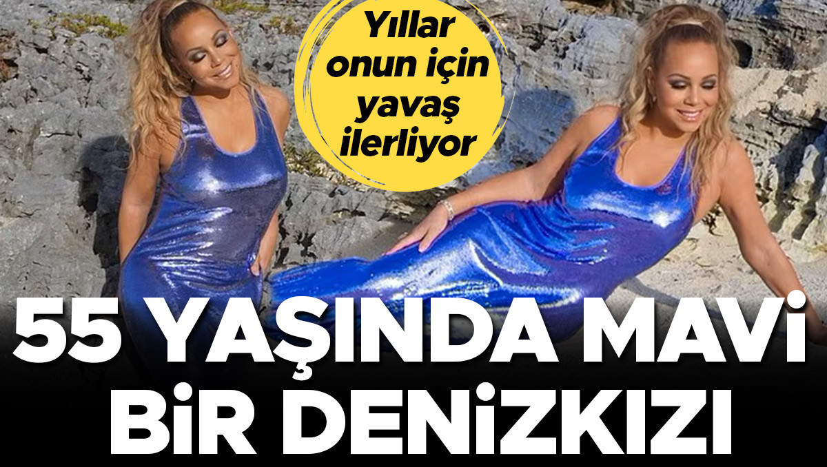 Deniz kıyısında, kumların üzerine uzandığı pozlarında üzerinde parıltılı, uzun mavi bir elbise olan Mariah Carey adeta bir denizkızını andırıyordu.