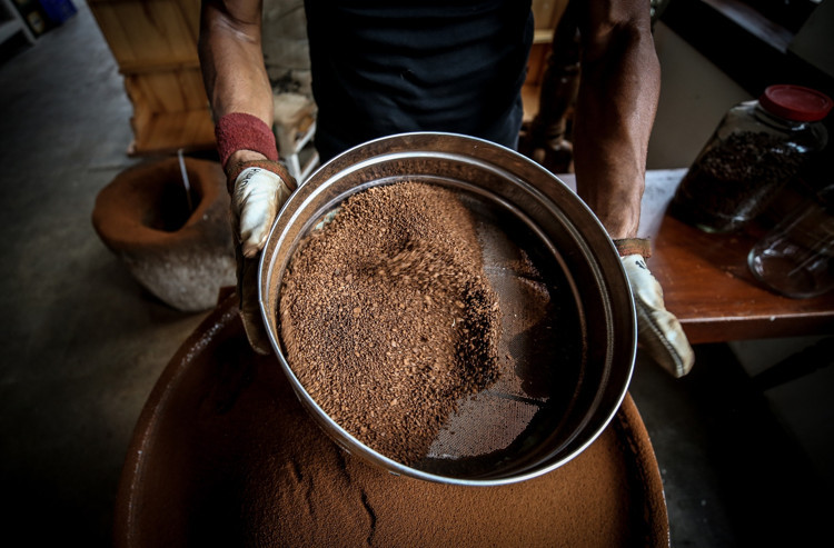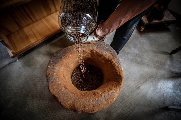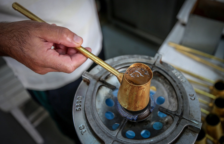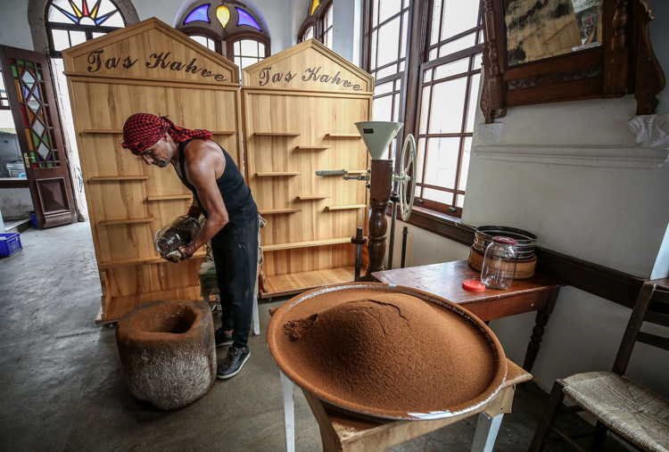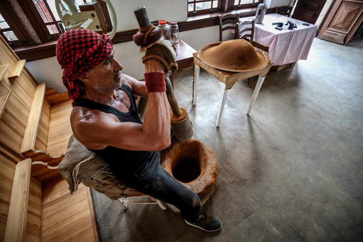 Tarihi dibek taşında 30 kilogramlık tokmaklarla vurularak öğütülen kahve çekirdekleri, elenerek pişirildiği pirinç cezvelerde kıvamı ve lezzetiyle müşterilerinin damaklarını tatlandırıyor.