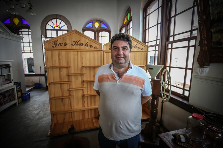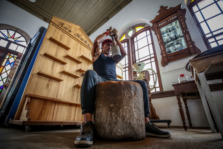 "Döverek yaptığımız bu kahvenin adı 'dibek kahvesi' ve adını dibek taşından alıyor. Bu taş 150 yıllık. Dedemiz mübadele sırasında Girit'ten gelirken yanında getirmiş. Çok ağır bir taş ama getirmeyi başarmış çünkü orada da babasıyla beraber kahvecilik yapıyormuş. Herhalde aidiyet hissedeceği bir parça olsun istemiş ve onu da getirmiş. Makinelerin olmadığı dönemde kahvenin öğütülme şekliymiş. Bu sebeple bizim için de kıymetli ve elimizden geldiğince bu geleneği yaşatmaya çalışıyoruz."