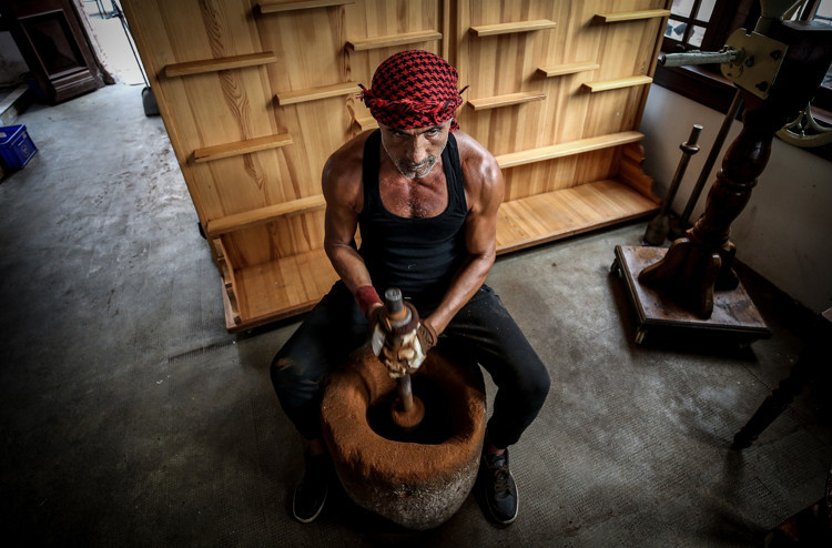 İşini yıllardır severek yaptığını vurgulayan Toprak, "Her gün geliyorum ve önce taşın oyuğuna kahve çekirdeklerini atıyorum. Daha sonra çekirdekleri demir tokmakla dövmeye başlıyorum. Her 300 vuruşta tepsiye eleme yapıyorum. Gün boyu bu işleme devam ediyorum. 8-10 saat süren bu işlemde yaklaşık 10 kilogram kahve elde edebiliyorum. 30 kilogramlık tokmağı her gün 10 bin defa kaldırıp indiriyorum." diye konuştu.