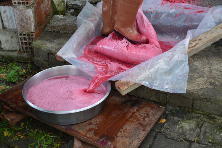 Dalından tek tek topladıkları narları ikiye bölen kadınlar, daha sonra sopalarla vurarak nar tanelerini kabuğundan ayıklıyor. Çuvalların içerisine konulan nar tanelerinin tepelemek suretiyle suyu çıkartılıyor.