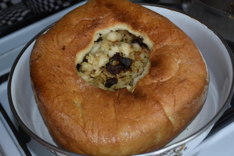 Dolmalık ekmeği fırıncılardan alan vatandaşlar ise, ekmeğin üzerinden bir parça keserek içini kıyma ve kavurma gibi malzemelerle dolduruyor.