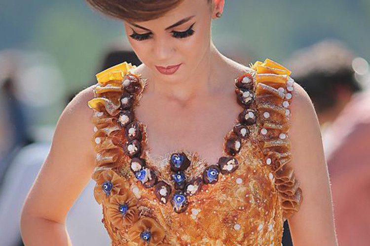Ankara'da açılan '4'üncü Türkiye Kooperatifler Fuarı'nda, Gümüşhaneli tasarımcı Ayşegül Öznur Parlak'ın, pestil ve köme (cevizli sucuk) ile süsleyerek hazırladığı gelinliği ilgi gördü.