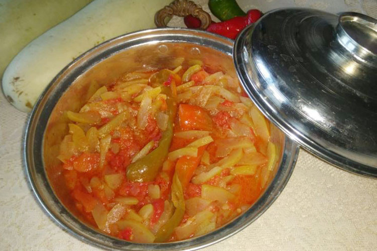Bu arada tencereye tereyağı ve sıvı yağı koyup ince ince doğradığımız soğanları da ilave edelim. Soğanlar kavrulunca pul biberi ekleyelim. Suda beklettiğimiz kabakları iyice yıkayıp suyunu süzdükten sonra tencereye koyalım. Aynı zamanda Domatesleri, salçayı, biberleri ve yemeğin tuzunu da ilave edip karıştırdıktan sonra tencerenin kapağını kapatalım. Orta derece ateşte kabakları yumuşayana kadar pişirelim.