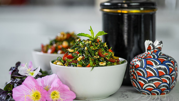 Maydanoz ,soğan .sarımsak ve domatesi ince kıyalım .Yeşil zeytinlerin çekirdeklerini alalım aynı şekilde ince kıyalım ve bütün malzemeleri salata kabına alarak üzerine pul biber ,nar ekşisi, zeytinyağı tuz ekleyip karıştıralım