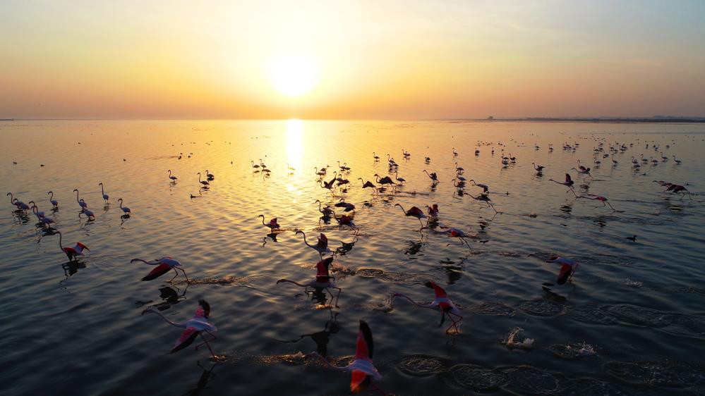 Dronla havadan görüntülenen flamingolar, güneşin doğuşuyla birlikte doğa harikası lagüne ayrı bir güzellik kattı. Binlerce kuşu barındıran lagün, her gün fotoğrafseverleri de konuk ediyor. Ancak bu sene kuraklık nedeniyle lagünde suların ve kuş çeşitliliğinin azaldığı görüldü.