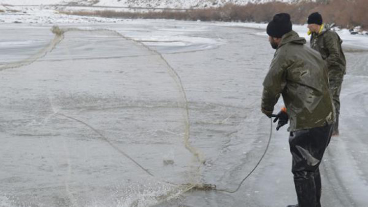 AĞRI'da geçimlerini balıkçılıktan sağlayanlar, dondurucu soğukta büyük bölümü buzla kaplanan Murat Nehri'nde açtıkları delikten ağ atarak balık avlıyor.