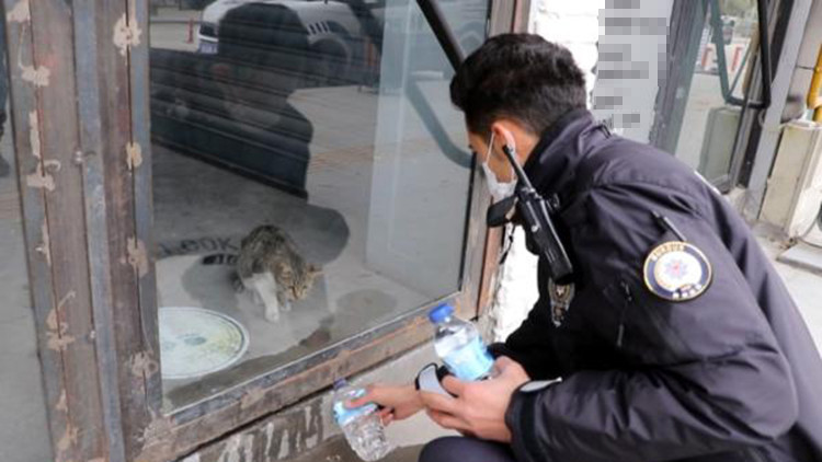 kafeterya sahibini iş yerini açması için çağırdı. Bu sırada bir polis memuru, 2 gün boyunca aç ve susuz kalan kediye, pet şişedeki suyu, kapının altından içirmeye çalıştı. Kafeterya sahibinin gelmesiyle kedi