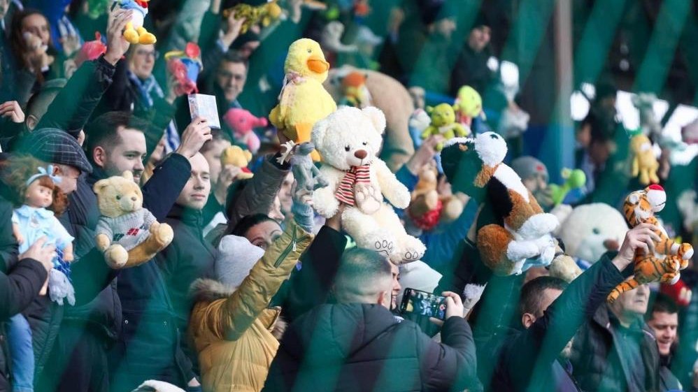 Pomozi.ba insani yardım kuruluşu tarafından organize edilen oyuncak toplama kampanyasında, maç öncesi yüzlerce taraftar beraberinde getirdikleri oyuncakları sahaya gönderdi.