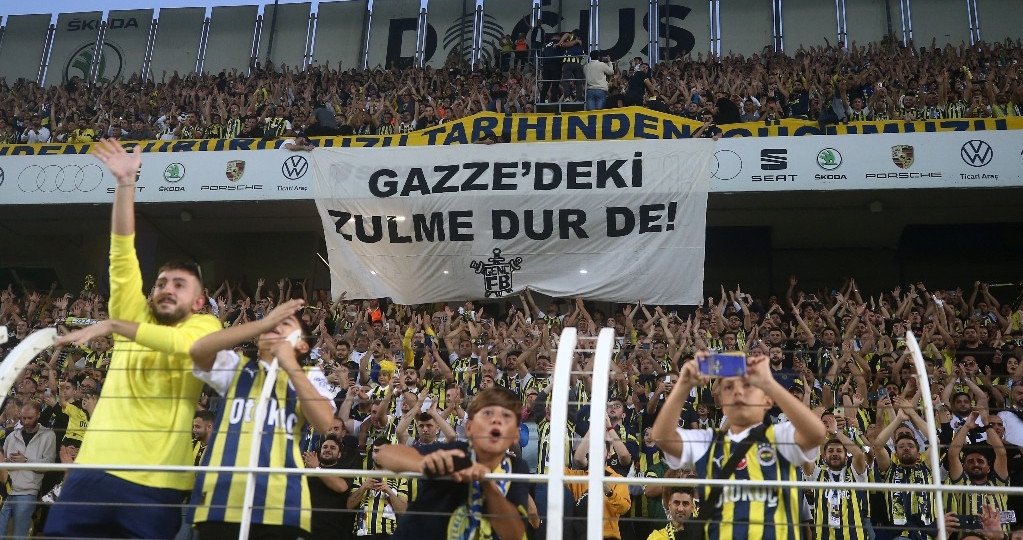 Trendyol Süper Lig’in 9. haftasında oynanacak olan Fenerbahçe - Hatayspor müsabakası öncesi Ülker Stadı’nda bulunan sarı-lacivertli taraftarlar, yaşanan olaylardan dolayı 'Gazze’deki zulme dur de' yazılı pankart açarak Filistin halkına desteğini gösterdi. Fenerbahçe tribünlerinde Filistin bayrağı açıldığı da görüldü.