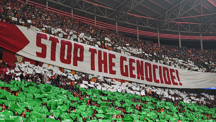 Galatasaraylı taraftarların Şampiyonlar Ligi’nde Bodo/Glimt ile oynan maç öncesi dev Filistin bayrağı ve “Soykırımı durdurun” (Stop The Genocide) yazısıyla oluşturdukları koreografi İsrail medyasını rahatsız etti.