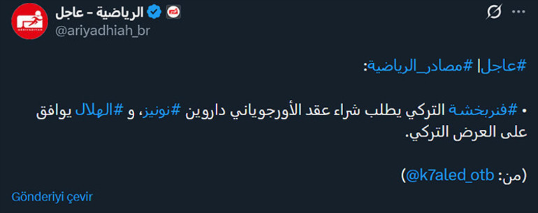 Suudi spor gazetesi Ariyadhiah'ın haberine göre; Fenerbahçe, Al-Hilal'in Uruguaylı golcüsü Darwin Nunez'i kadrosuna katmak için resmi teklifte bulundu.