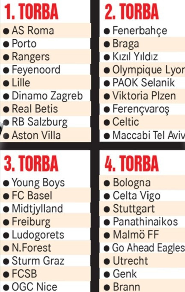 2. Torba: FENERBAHÇE, Braga, Kızılyıldız, Lyon, PAOK, Viktoria Plzen, Ferencvaros, Celtic, Maccabi Tel Aviv