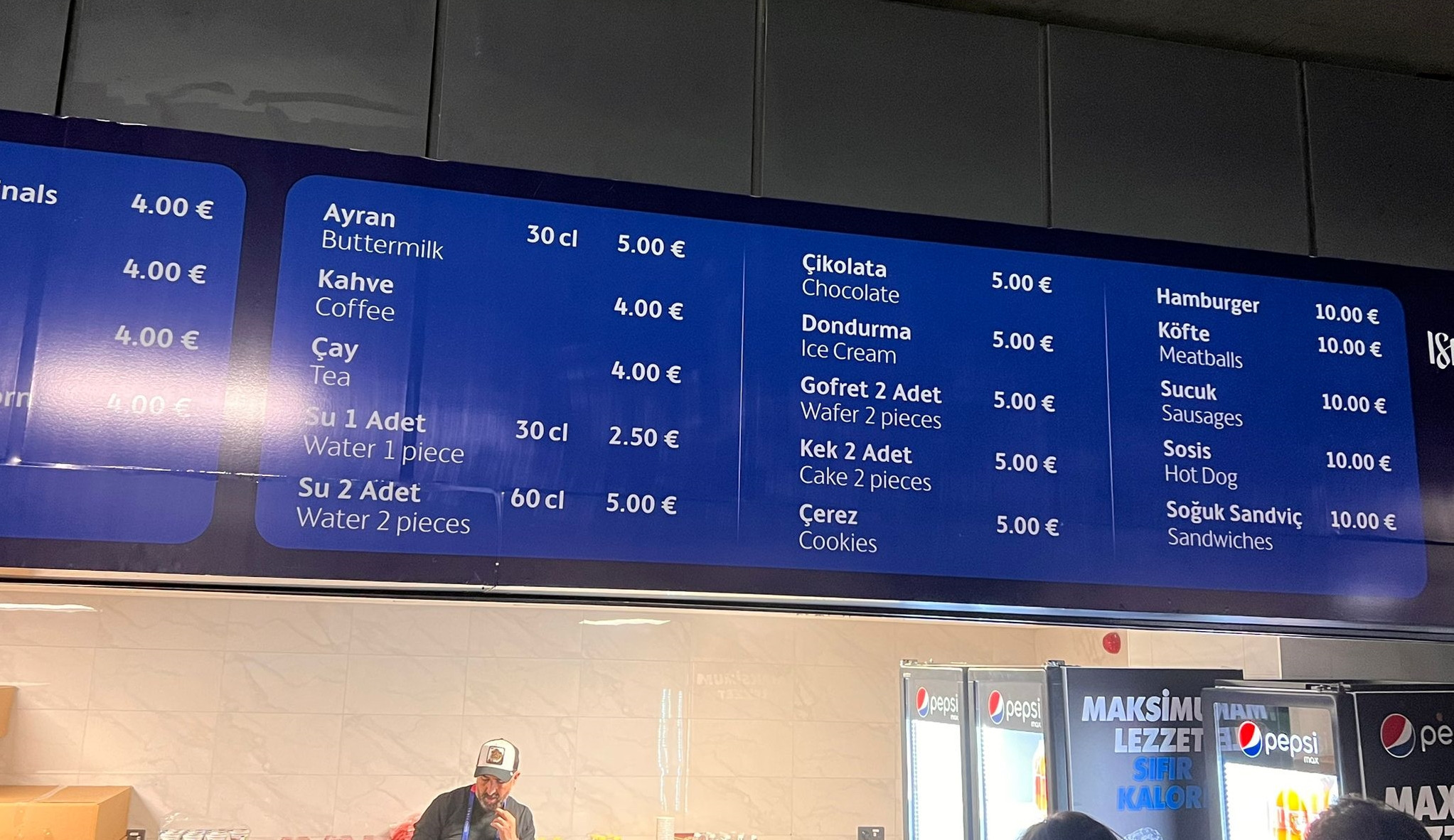 Fiyat tabelasında yer alan rakamların karşısında Euro amblemi olduğuna dikkat etmeyen Türk futbolseverler, fiyatların TL bazından olmadığını öğrenince şaşkınlık yaşadı. Aşırı pahalı fiyatlar nedeniyle Türkler’in mecbur kalmadıkça büfelerden alışveriş yapmadığı dikkat çekti.