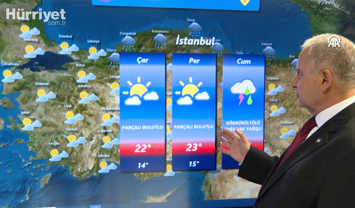 İstanbul'da cuma ve cumartesi günü sağanak geçişleri beklendiğini söyleyen Macit, hava sıcaklığının 22 ila 23 derece civarında olacağını kaydetti.