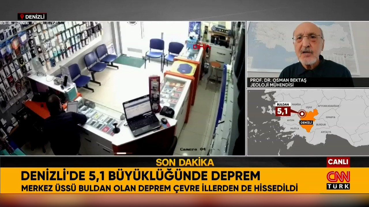 AFAD tarafından kaydedilen verilere göre Denizli'de 5.1 büyüklüğünde deprem meydana geldi. Deprem sonrası CNN Türk canlı yayınında konuşan Jeoloji Mühendisi Prof. Dr. Osman Bektaş, bölgede daha büyük bir depremin olup olmayacağıyla ilgili soruya "Ege Bölgesi'nin karakteristik depremleri 6 ile 7 büyüklüğü arasında değişir. Bu konuda bir şey söylemek mümkün değil." dedi.