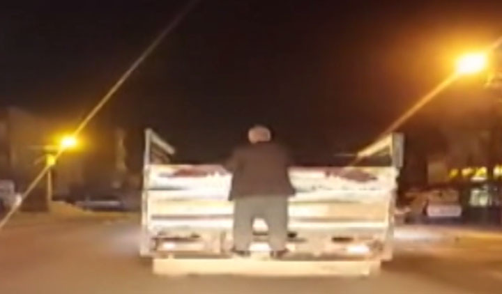 Bismil ilçesi kırsal Aralık Mahallesi Kooperatif mevkisinde bir kişi, plakası öğrenilemeyen seyir halindeki kamyonetin arkasına asılıp yolculuk etti. O anlar, trafikteki başka aracın sürücüsü tarafından cep telefonuyla kaydedildi.