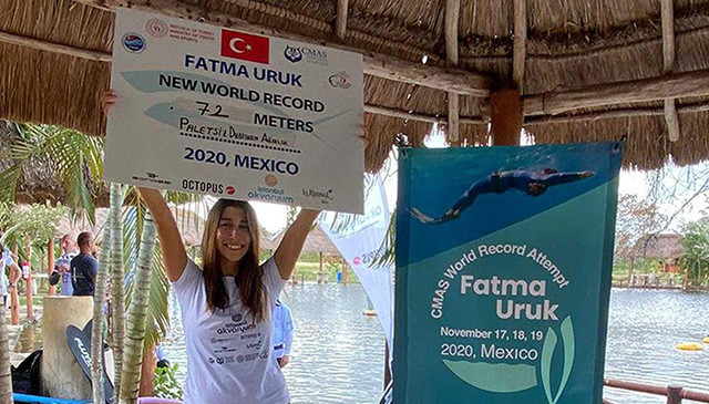 Serbest dalışçı Fatma Uruk, Maya Uygarlığının kurban ve adak töreni yaptığı, giren insanın kutsandığına inanılan Yum-Kin adlı cenotede rekorlar denemeye başladı. 8 aydır Meksika'da bulunan, pandemi döneminde özellikle Gençlik ve Spor Bakanlığı'nın desteklediği ve hep yanında olduğu milli sporcu bugünkü dalışında rekor kırdı. Paletsiz değişken ağırlık dalışta daha önce Şahika Ercümen 65 metre dalmış, ardından 68 metre dalan Derya Can sonra rekorunu 70 metreye çıkarmıştı. Fatma Uruk 72 metre derinliğe dalarak rekoru eline geçirdi. 2 dakika 10 saniye süren rekor denemesinden başarıyla çıkan Fatma Uruk, Meksika'daki rekor deneme dalışlarına 2 gün daha devam edecek. Uruk, yarın çift palet sabit ağırlık olarak dalış yapıp 67 metreye ulaşmaya çalışacak. Bu dalışta rekor 65 metre ile Rus Sporcu Olga Davydova'da bulunuyor.