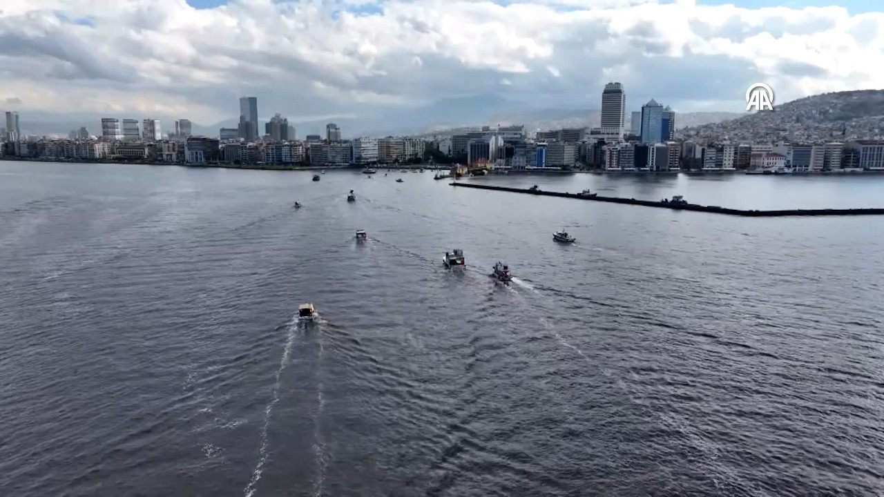 İzmir'de, Türk ve Filistin bayraklarıyla denize açılan tekneler Filistin ile Gazze'ye insani yardım ulaştırmak amacıyla yola çıkan ve İsrail'in saldırısına uğrayan Küresel Sumud Filosu'na destek verdi.