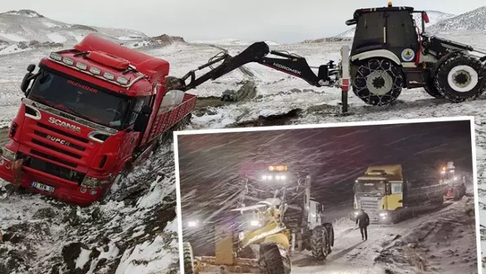 Kar ve tipide yolda kalan 6 TIR, 22 saatlik çalışmayla kurtarıldı