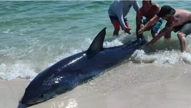 Kıyıya vuran köpek balığını kuyruğundan çekerek okyanusa bıraktılar