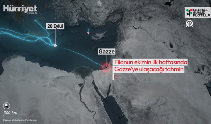 Gazze'ye insani yardım koridoru açmak ve İsrail'in ambargosunu kırmak hedefiyle yola çıkan Küresel Sumud Filosu, Akdeniz'deki seyrini sürdürüyor.