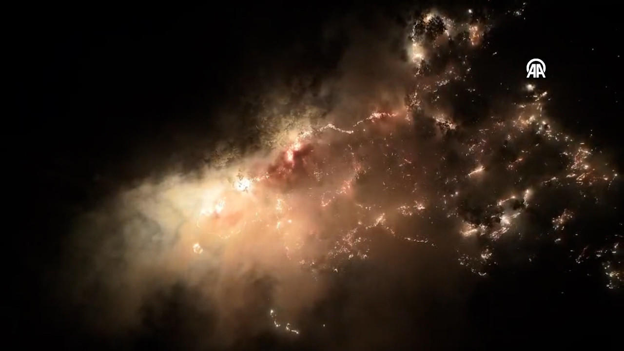 Görüntülerde, yangının geniş bir alana yayılması ve ekiplerin yoğun mücadelesi yer alıyor.