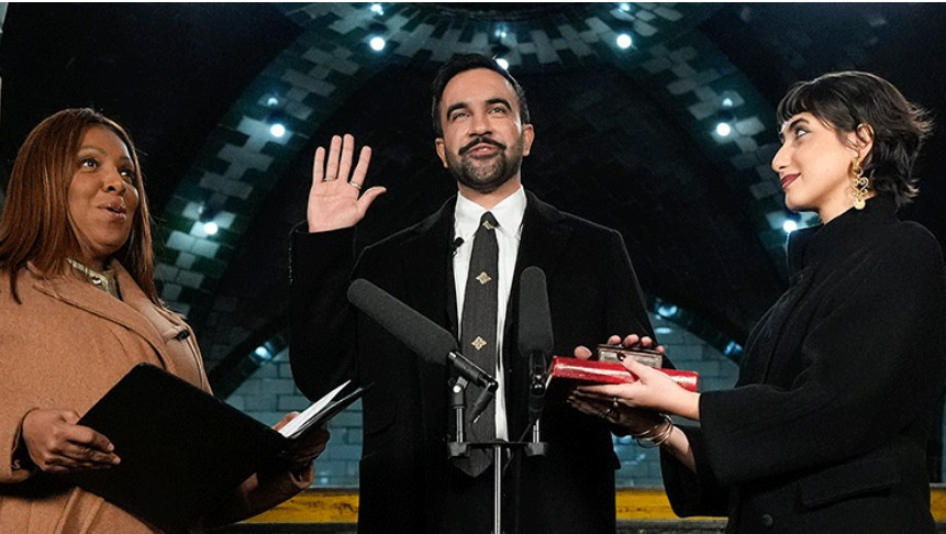 New York’un seçilmiş belediye başkanı Zohran Mamdani, 1 Ocak 2026’da gece yarısından hemen sonra, City Hall Park’ın altındaki kapalı ve tarihi Old City Hall metro istasyonunda düzenlenen özel bir törenle Kur’an-ı Kerim üzerine el basarak yemin etti.