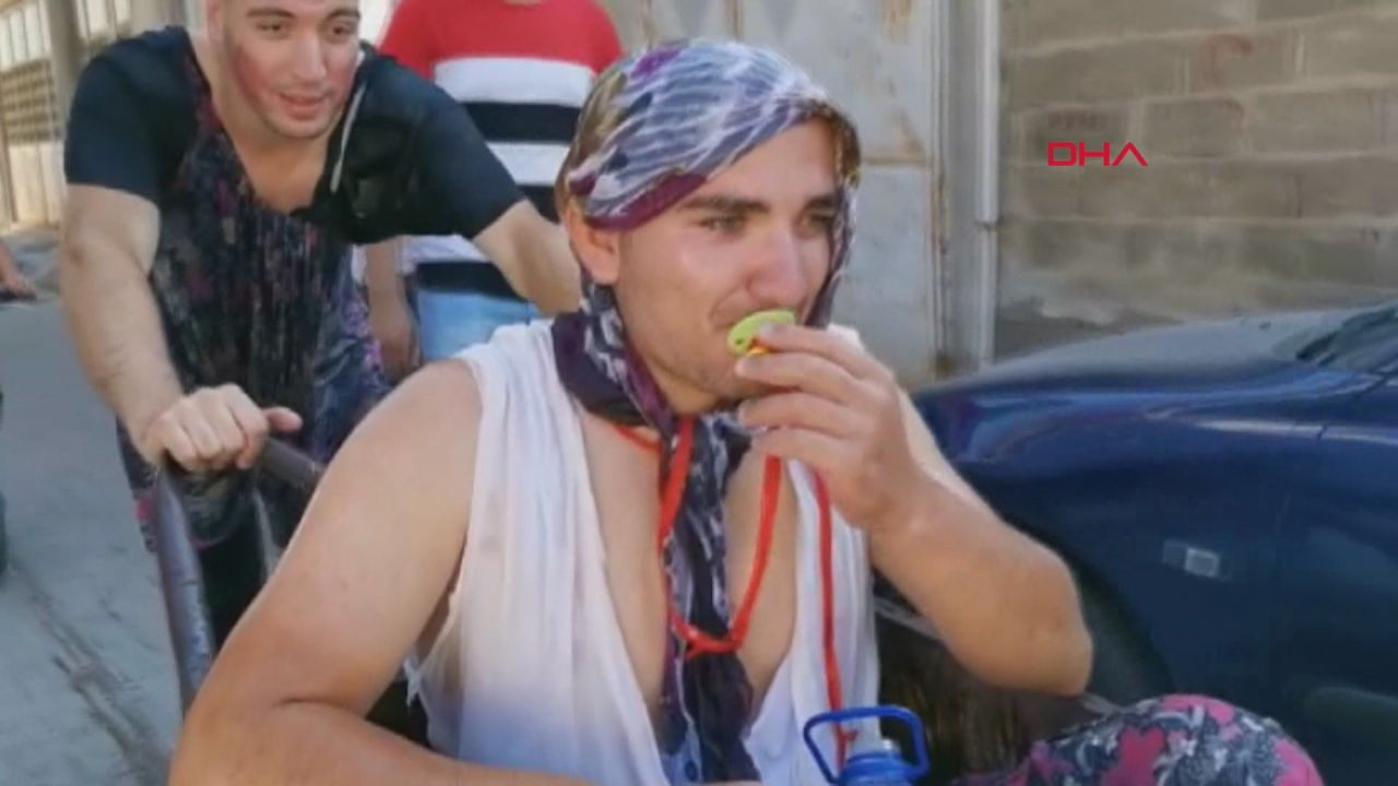 BURSA'nın İznik ilçesinde, düğün öncesi, damat Özkan Uslu'ya arkadaşları tarafından yapılan şakalar, görenleri güldürdü. Şalvar giydirilen damat başında tülbent ve ağzında emzikle, el arabasıyla sokak sokak gezdirildi. Damat, gelin evine emekleyerek gitti.