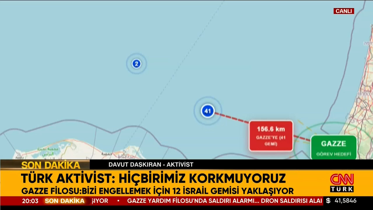 İsrail'in ablukası altındaki Gazze'ye insani yardım taşıyan Küresel Sumud Filosu'nun, 'Yüksek riskli bölgeye girdikleri' açıklandı. Tekneleri engellemek için 12 İsrail gemisinin ise filoya yaklaştığı ifade ediliyor.