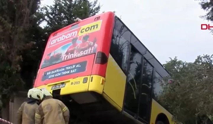 Üsküdar’da freni patlayan İETT otobüsü yokuş aşağı seyir halindeyken kontrolden çıkarak istinat duvarına çarptı. Çarpmanın etkisiyle duvarı yıkan otobüs, asılı halde kaldı. Olay yerine çok sayıda ekip sevk edildi