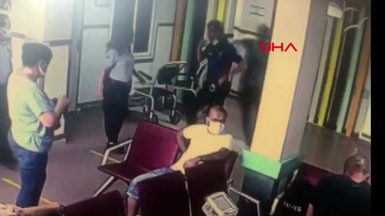 Bu arada, M.K'nin polis memuru F.Ü.'nün beylik tabancasını aldığı anlar hastanenin güvenlik kamerasına yansıdı. Görüntülerde M.K., polis memurunun belinden beylik tabancasını alıyor. Durumu fark eden polis memuru ve vatandaşlar dışarı kaçıyor. Bir vatandaş ile hastanenin güvenlik görevlisi de saklanarak korunmaya çalışıyor. M.K. de herkes çıktıktan sonra dışarı çıkıyor.