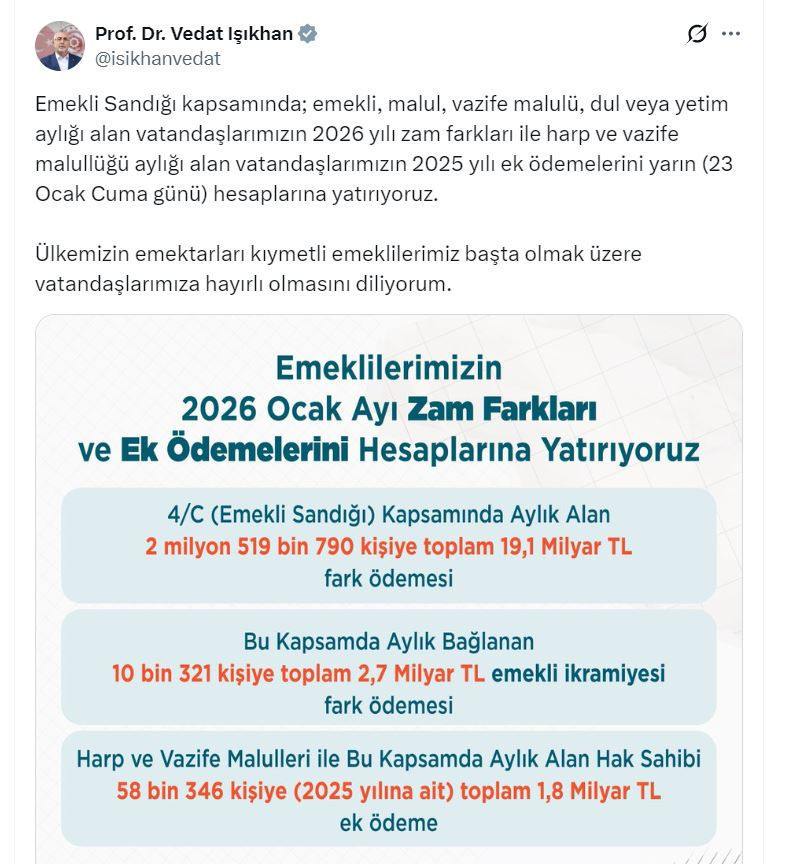 Bakan Işıkhan, sanal medya hesabından yaptığı açıklamada, "Emekli Sandığı kapsamında; emekli, malul, vazife malulü, dul veya yetim aylığı alan vatandaşlarımızın 2026 yılı zam farkları ile harp ve vazife malullüğü aylığı alan vatandaşlarımızın 2025 yılı ek ödemelerini yarın (23 Ocak Cuma günü) hesaplarına yatırıyoruz. Ülkemizin emektarları kıymetli emeklilerimiz başta olmak üzere vatandaşlarımıza hayırlı olmasını diliyorum" dedi.