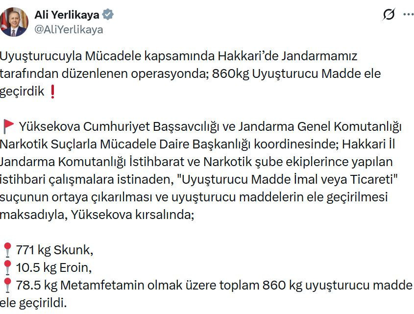 Bakan Yerlikaya, jandarma tarafından düzenlenen narkotik operasyonunu sanal medya hesabından duyurdu. Buna göre; Yüksekova Cumhuriyet Başsavcılığı koordinesinde yapılan istihbarı çalışmalar kapsamında düzenlenen operasyonda, Yüksekova kırsalında 771 kilogram skunk, 10,5 kilogram eroin, 78,5 kilogram metamfetamin olmak üzere toplam 860 kilogram uyuşturucu madde ele geçirildi. Yerlikaya, "Uyuşturucuyla mücadele, yalnızca bir iç güvenlik meselesi değildir. Bu mücadele, küresel bir güvenlik mücadelesidir. Daha önce de ifade ettim. Biz, uyuşturucuya topyekun savaş açtık. Bu savaşı da sadece ülkemiz adına değil, insanlık adına sürdürüyoruz. Sayın Cumhurbaşkanımızın liderliğinde, 'Türkiye Yüzyılı' vizyonuyla bir hedef koyduk: O hedef; ülkemizi uyuşturucuya karşı aşılmaz, erişilmez bir kale haline getirmektir" dedi. (DHA)