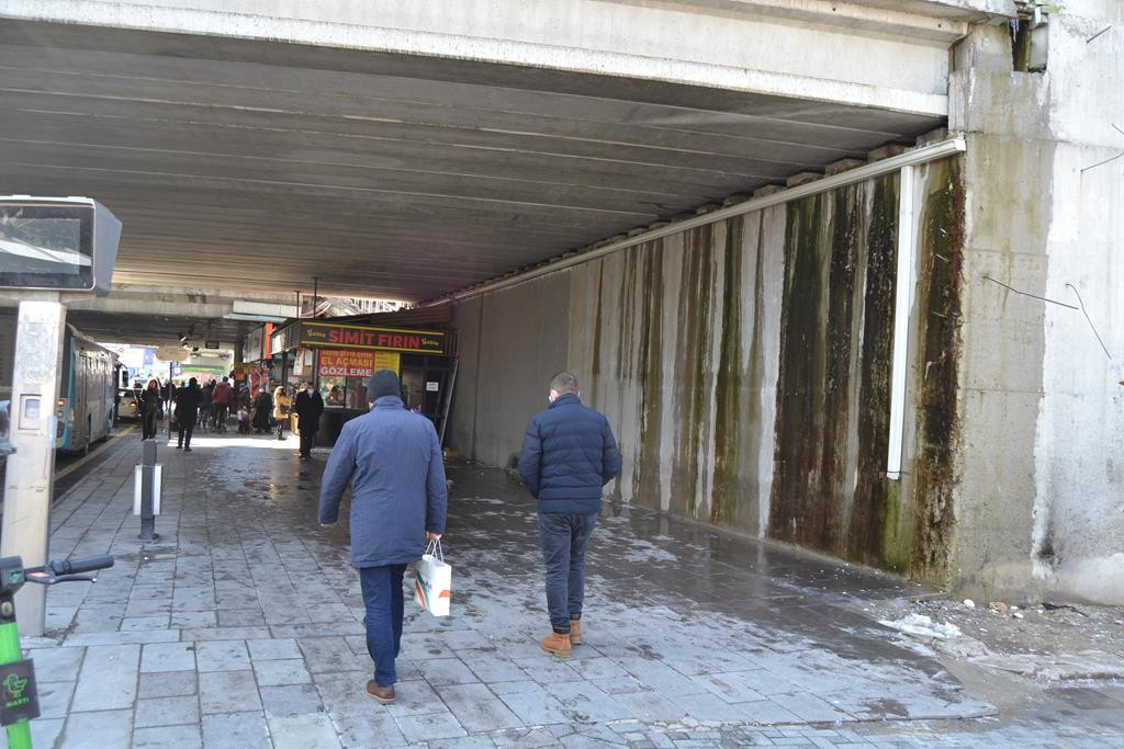 DUVARDAN KALDIRIMA AKIYOR“Köprüden aşağıya gelen boru bir gidere bağlanmadığı için duvardan kaldırıma açıktan sürekli su akıyor. Bu nedenle kaldırım da sürekli ıslak halde. İnsanlar bu taraftan geçemiyor. Kış aylarında soğuk havalarda buzlanma da oluyor. Hemen yanında otobüs durakları var insanlar bekliyor. Buradaki dükkânlardan alışveriş yapanlar var, sürekli bir hareketlilik söz konusu.