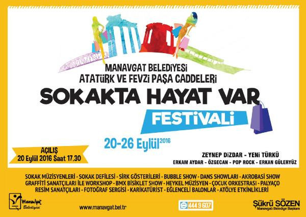 Manavgat Belediyesi, kentteki hareketliliği ve alışveriş canlılığını artırarak, esnafa can suyu olabilmek, turizme katkı sağlamak amacıyla 'Sokakta Hayat Var Festivali' düzenleyecek. Manavgat Belediyesi'nin çevre düzenlemesini bitirdiği Atatürk ve Fevzi Paşa caddelerinde 20-26 Eylül tarihlerinde yapılacak festival için hazırlıklar sürüyor. 20 Eylül'de açılış töreni ve kortej geçişiyle başlayacak festival, 26 Eylül akşamına kadar her yaştan ve her kesimden kişiye hitap edecek renkli ve eğlenceli etkinliklerle sürecek.