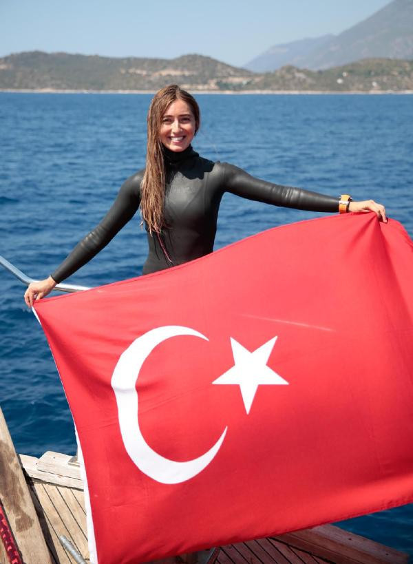 Ahmet ACAR / KAŞ(Antalya), (DHA)- ANTALYA'nın Kaş İlçesi'nde düzenlenen Serbest Dalış Outdoor Türkiye Şampiyonası'nda çift palet kategorisinde Şahika Ercümen, 65 metreye dalarak Türkiye rekoru kırdı.