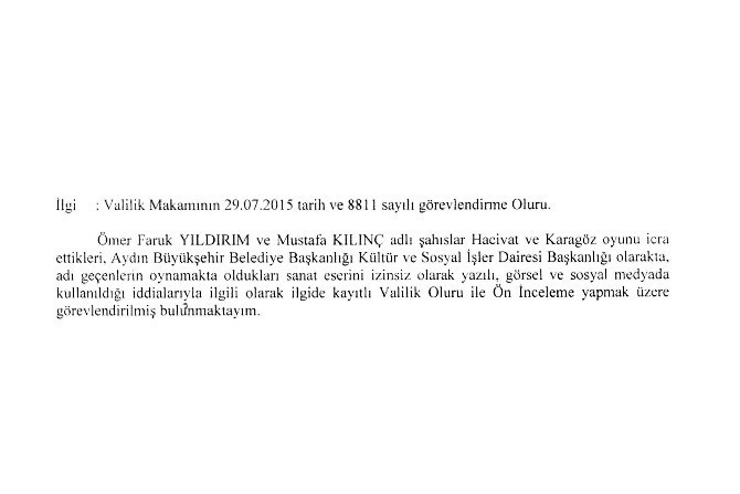 Aydın Valiliği, 2014 yılı Ramazan ayı etkinliklerindeki Hacivat-Karagöz oyununu sunan Ömer Faruk Yıldırım ve Mustafa Kılınç’ın şikayeti üzerine, 2015 yılı Ramazan ayı etkinliklerinde de aynı tanıtım görsellerini izinsiz kullandığı gerekçesiyle Aydın Büyükşehir Belediyesi hakkında soruşturma başlattı.