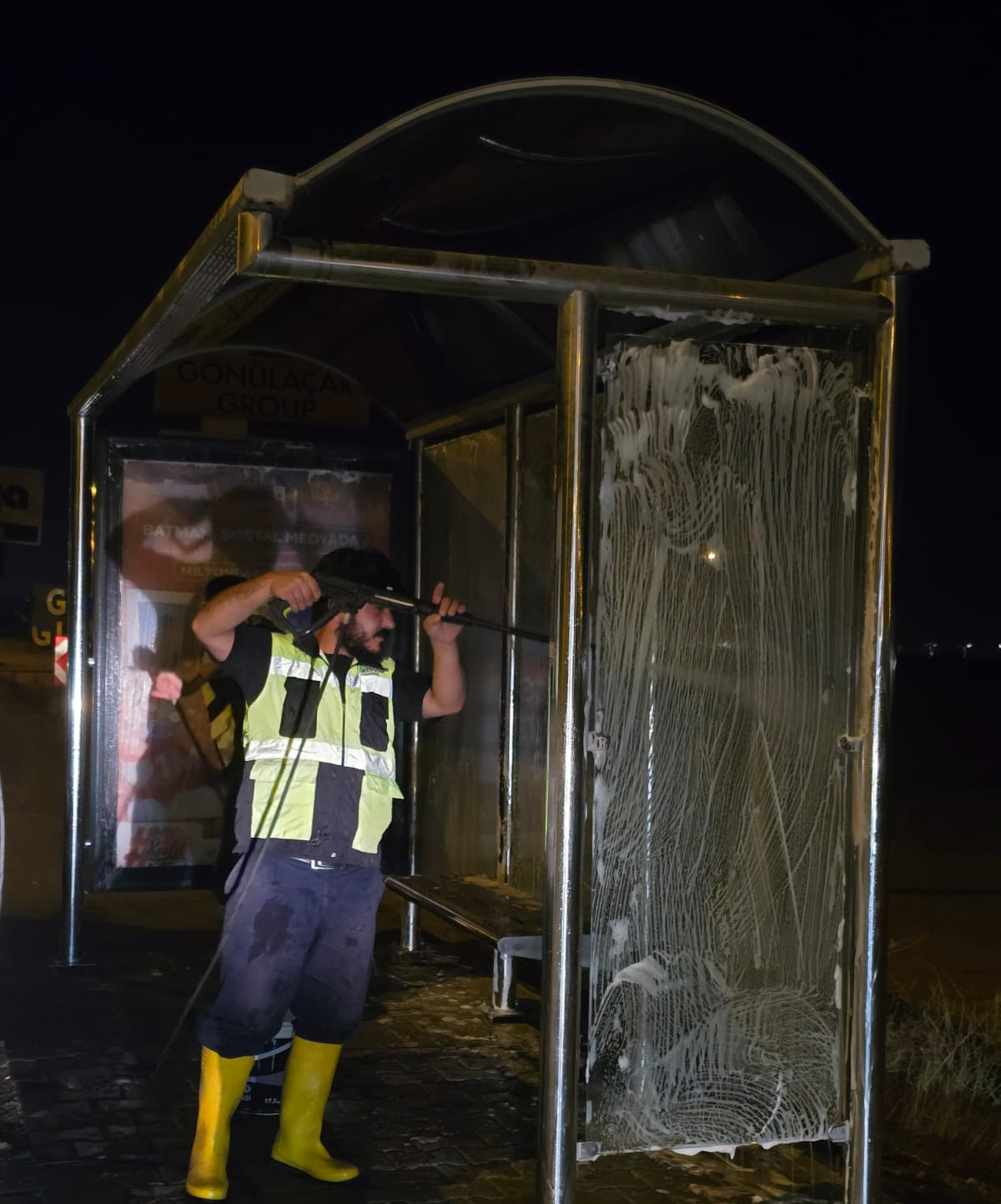 Belediye İşletme ve İştirakler Müdürlüğü ekiplerince yürütülen temizlik çalışmaları, vatandaşların mağdur olmaması için gece saatlerinde yapıldı ve sabahın ilk ışıklarına kadar sürdü. 87 otobüs ve 32 farklı hatta hizmet veren Batman Belediyesi, 831 otobüs durağından 306’sı kapalı tip olan durakların iç ve dış alanlarını deterjanlı suyla yıkayarak temizledi. Otobüs duraklarına izinsiz şekilde yapıştırılan reklam afişi, sticker ve benzeri materyallerin kötü görüntü oluşturduğu belirtilerek, vatandaşlardan bu konuda daha duyarlı olmaları istendi.