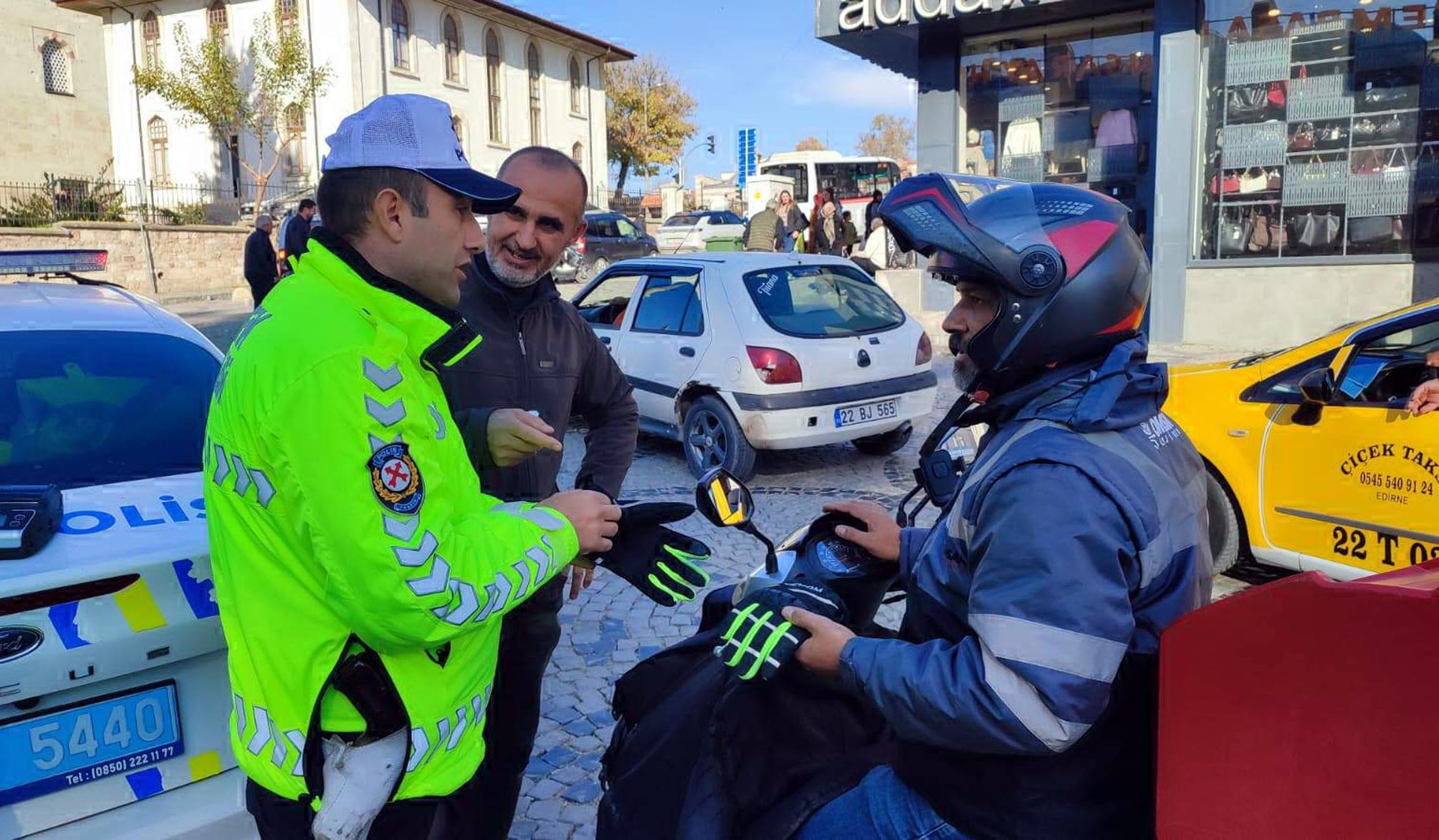 Batuhan SEVER/EDİRNE, (DHA)- EDİRNE'de polis ekipleri, yeni yönetmelikle zorunlu hale getirilen kask, eldiven ve koruyucu gözlük kullanımına yönelik motosiklet ve bisiklet sürücülerini denetledi.