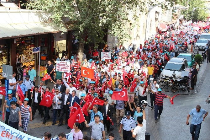 Ellerindeki Türk Bayrakları ve dövizlerle yürüyüşe başlayan kalabalık gruba caddelerdeki vatandaşlar da alkışlarla destek verdi. Teröre karşı birlik sloganları atan grup Gaziler Caddesi’nden yürüyerek, Balıklı Meydanı’na gelerek burada hep birlikte İstiklal Marşı okudu.