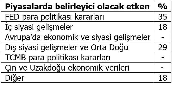 Fon yöneticilerine göre, ABD Merkez Bankası’nın (FED) para politikasına ilişkin kararlar, dış siyasi gelişmeler ve ortadoğu ile iç siyasi gelişmeler ikinci çeyrekte piyasaların yönünde belirleyici faktörler olacak. Anketin “Diğer” seçeneğine gelen cevaplar ise, “küresel para akışı”, “yurtiçi iktisadi temeller” ve “ticaret savaşları” olarak belirtildi.
