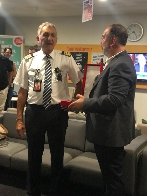 Pegasus Havayolları Genel Müdürü Mehmet Nane, uçuş sonrası düzenlenen veda töreninde Kaptan Pilot Reha Özdemir’e plaket takdim etti.