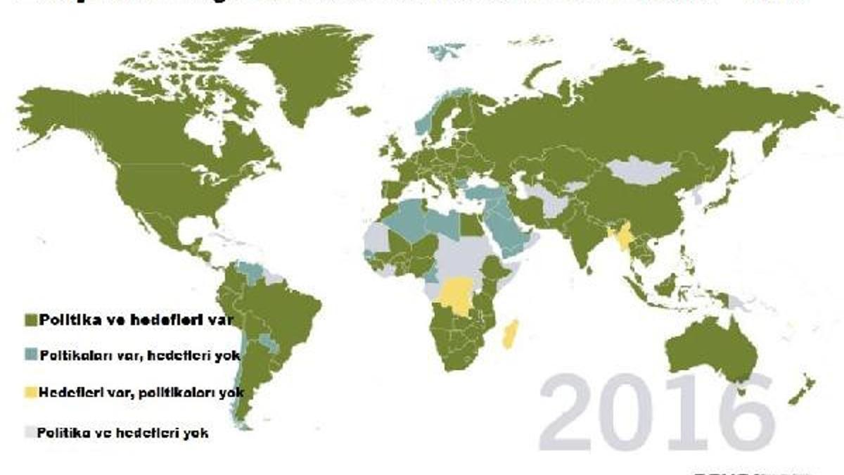 Raporda ayrıca, "hükümetlerin yenilebilir enerjiye verdiği destek" ile, özellikle güneş ve rüzgarın elektrik sektöründe hızlıca büyüdüğü belirtildi. Buna göre, 2016 başı itibariyle “173 ülkenin yenilebilir enerji hedefi, 146 ülkenin ise yenilebilir enerjiyi destekleyen politikaları” bulunuyor.